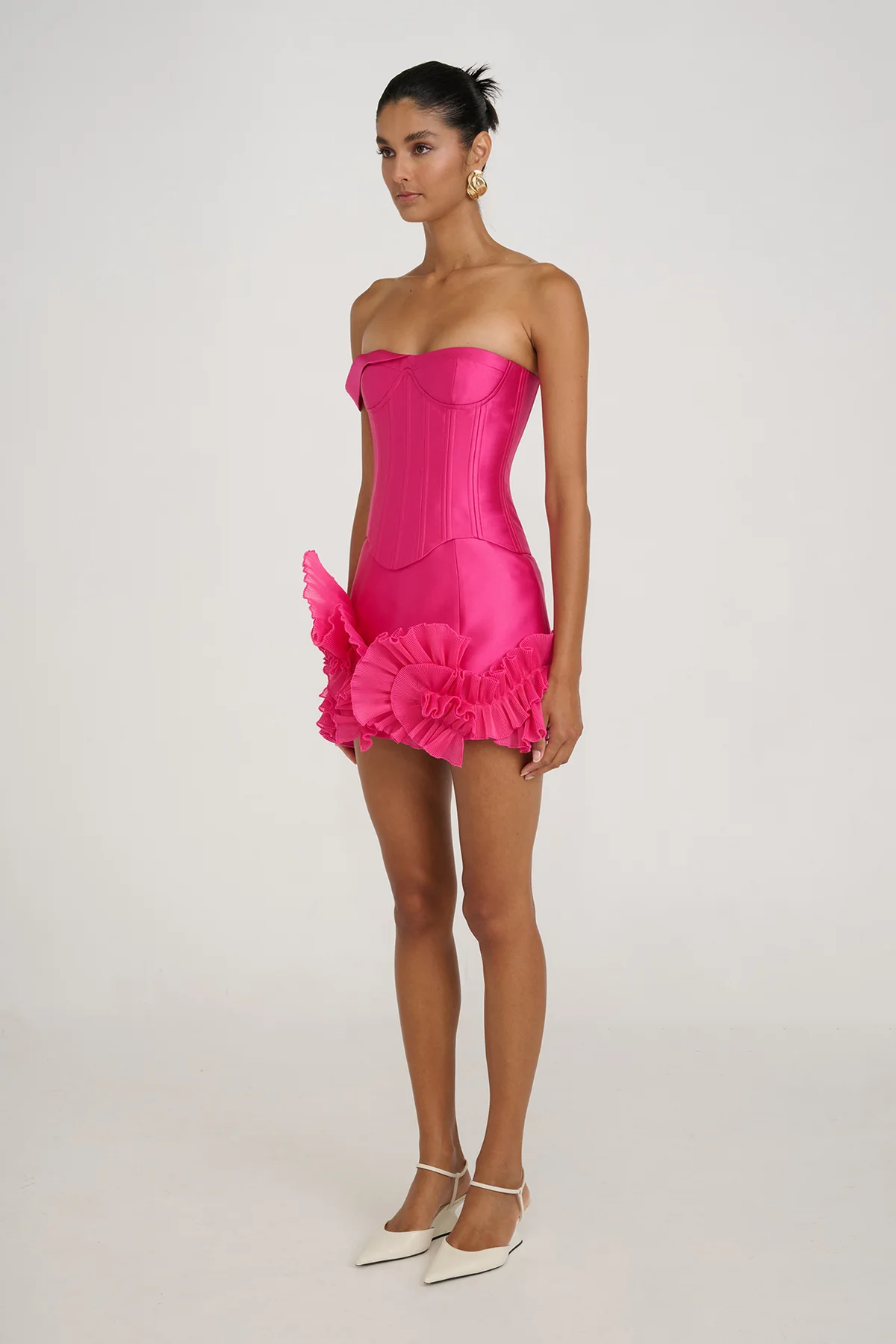 A striking expression of modern femininity, crafted in bold magenta tones with sculpted peony-inspired detailing. Designed to command attention with refined elegance, this piece is made for unforgettable nights and grand occasions.