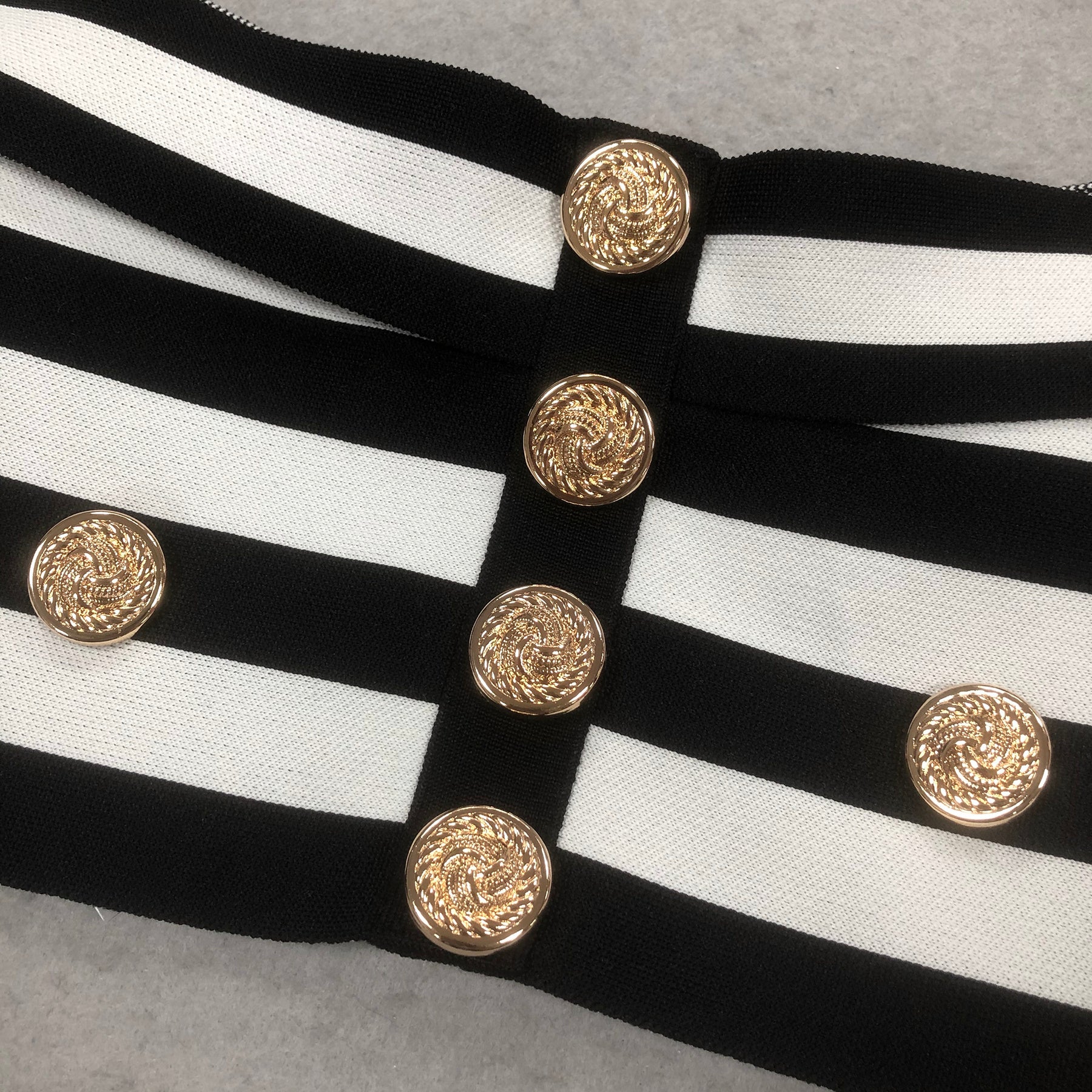 Channel timeless nautical sophistication with this exquisite two-piece knit set. Designed to sculpt and celebrate the feminine silhouette, the ensemble features bold monochromatic stripes crafted from a premium, structured knit fabric.