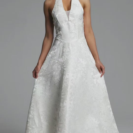 A vision of understated luxury, this ivory midi dress features a plunging halter neckline and a beautifully structured A-line skirt. The subtle, textured grid-weave fabric adds a contemporary depth to its timeless, statuesque silhouette.